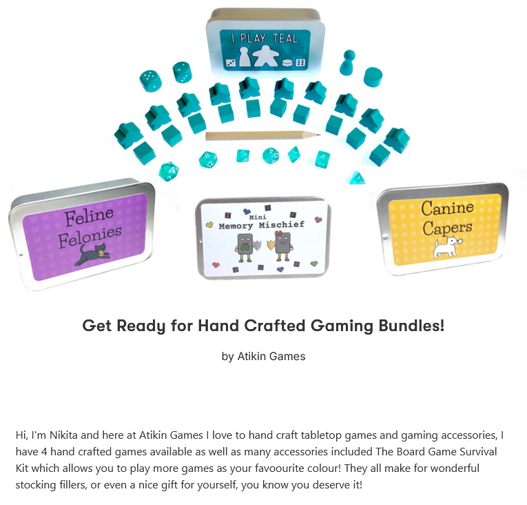 Backerkit Holiday Market – This year Backerkit have put together a group-collab event filled with creators ready to ship products from past campaigns. I think it’s a great idea and I’ve been working my tush off to put together a good campaign. I’ve built several bundles of my games and gaming accessories – most are hand crafted – and I’ve included a nice little discount in each.