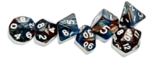 The “Stocking Filler Bundle” contains a mini dice set that you can pair with a crocheted mini dice bag or tin, also a D20 25mm button badge, 32mm Atikin Games button badge and a 58mm Dice Goblin badge.