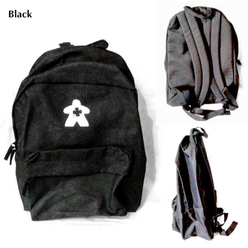Black – features a white lucky meeple with a four leaf clover cutout design, black strap and zip details