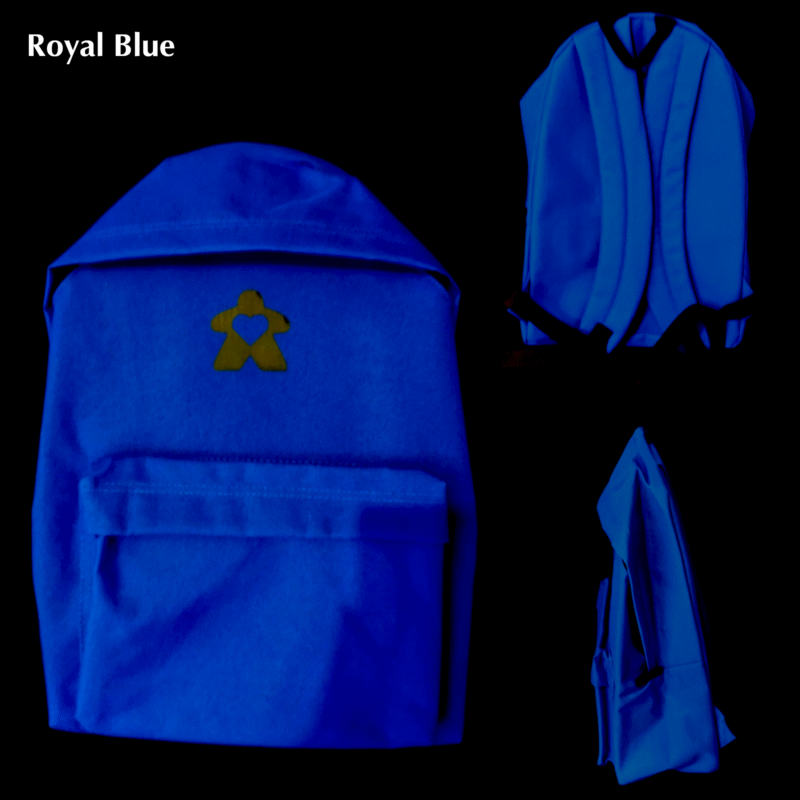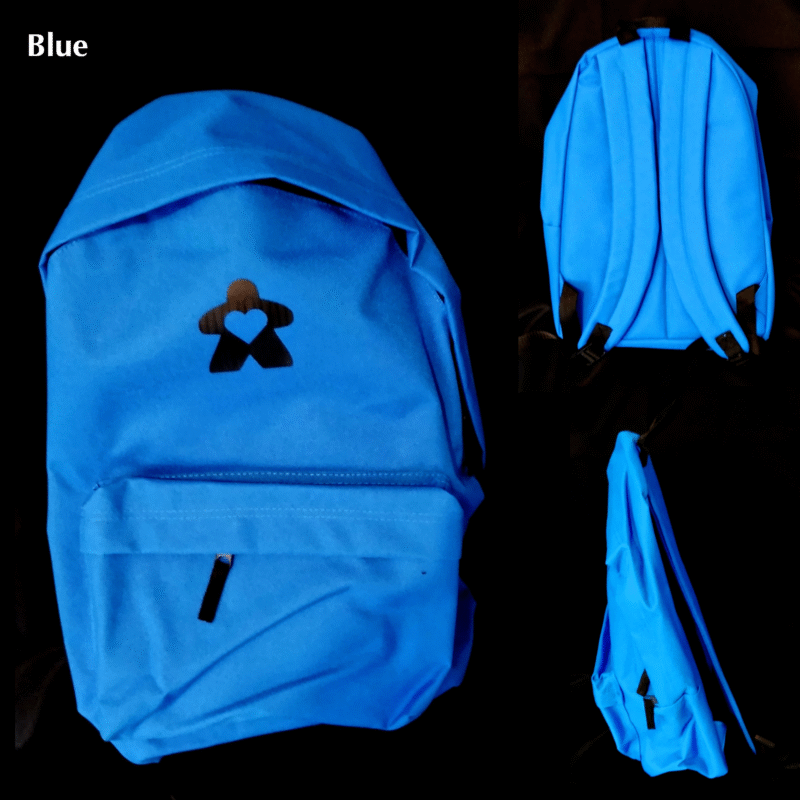 Blue – features a black meeple with a heart cutout design, with black strap and zip details