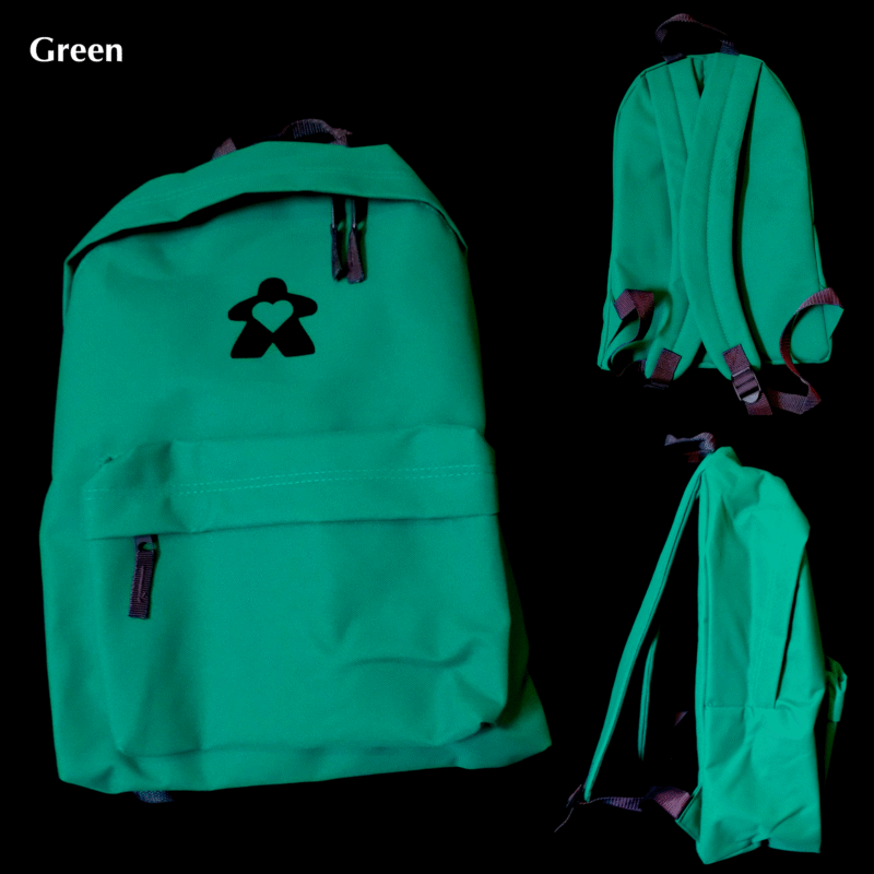 Green – features a black meeple with a heart cutout design, with dark grey strap and zip details