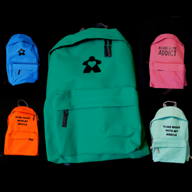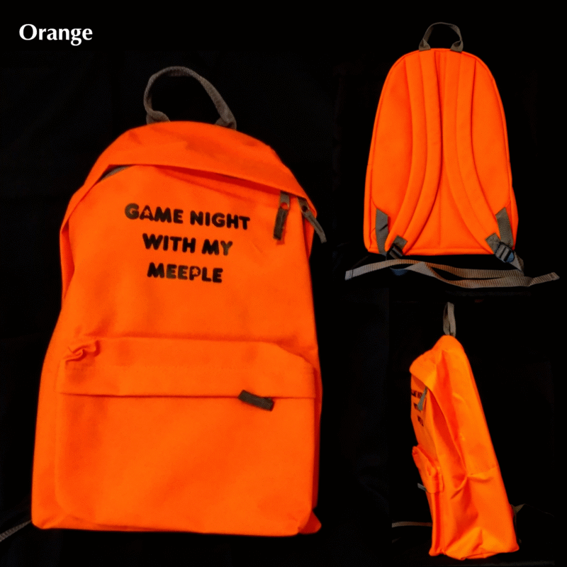 Orange – features the text “Game night with my meeple” in black, with dark grey strap and zip details