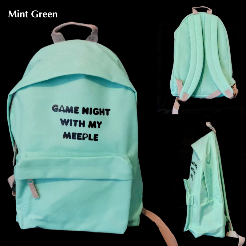 Mint Green – features the text “Game night with my meeple” in black, with light grey strap and zip details