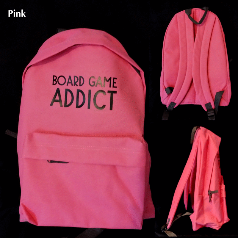 Pink – features the text “Board game addict” in black, with dark grey strap and zip details