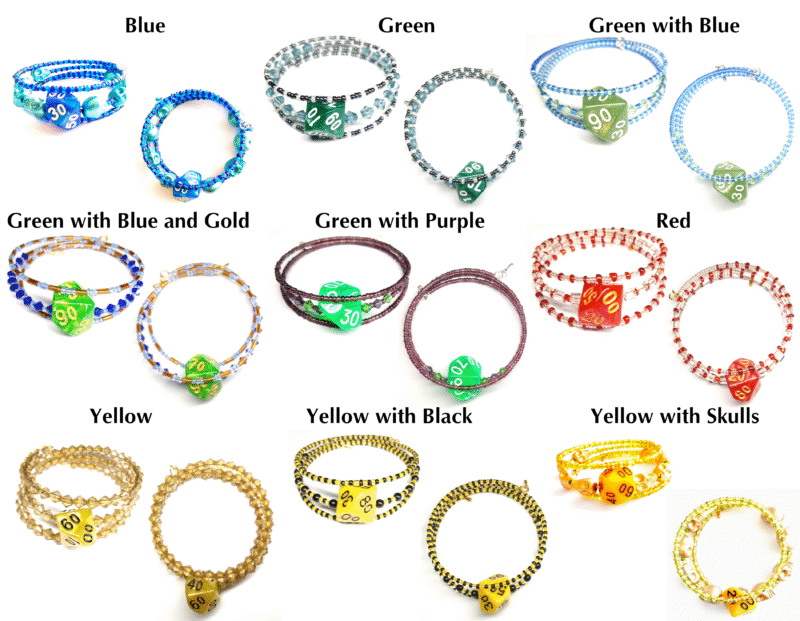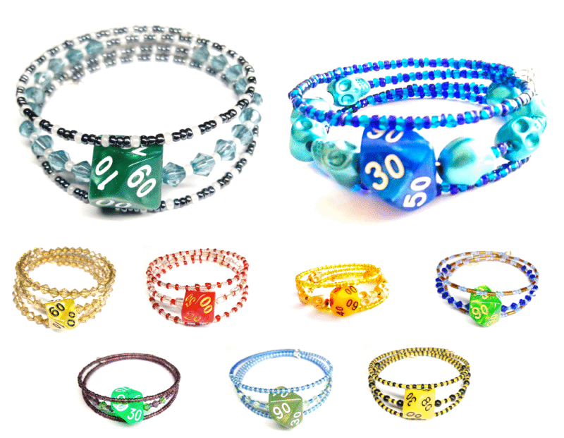 Made with steel memory wire plastic dice that are hand drilled by me and a mixture of glass and plastic beads.
