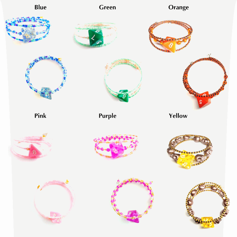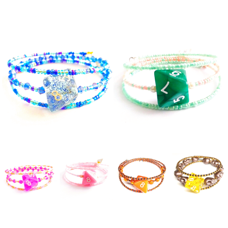 Made with steel memory wire plastic dice that are hand drilled by me and a mixture of glass and plastic beads.