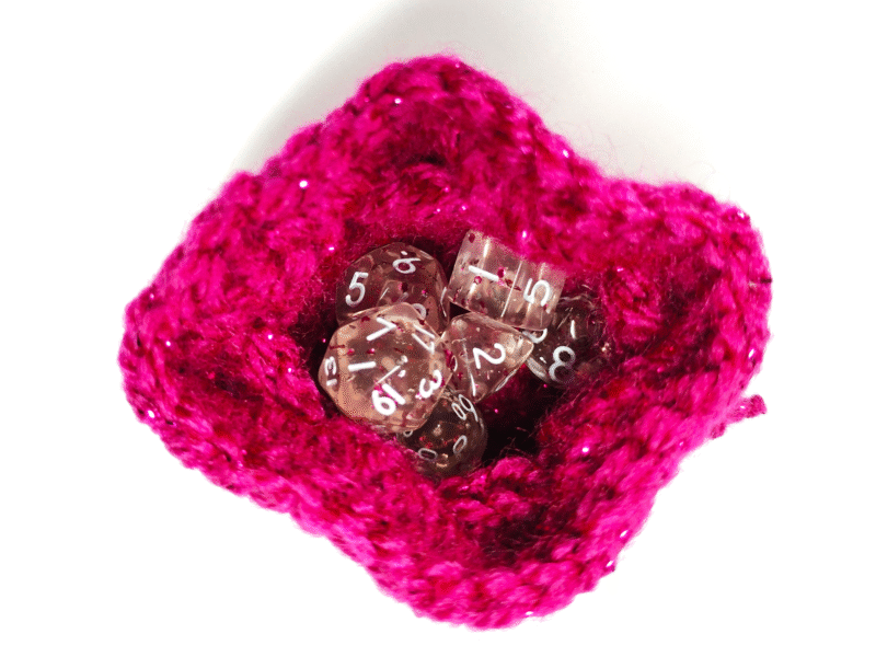 Handmade dark pink sparkly crocheted drawstring dice bag with adorable mini 7 piece dice set. Dice are all around 8-12mm, see the photo with the purple D6 dice for scale.
