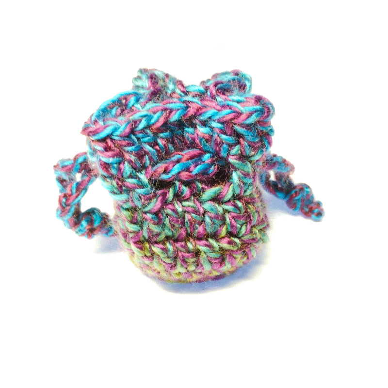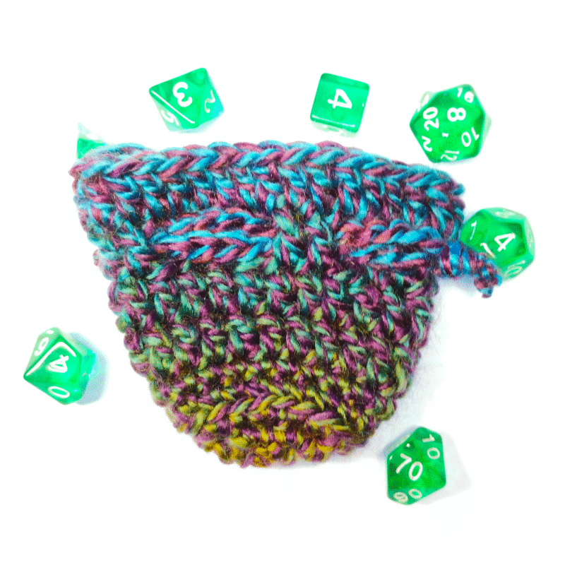 Handmade purple, blue, and green crocheted drawstring dice bag with adorable mini 7 piece dice set. Dice are all around 8-12mm, see the photo with the purple D6 dice for scale.