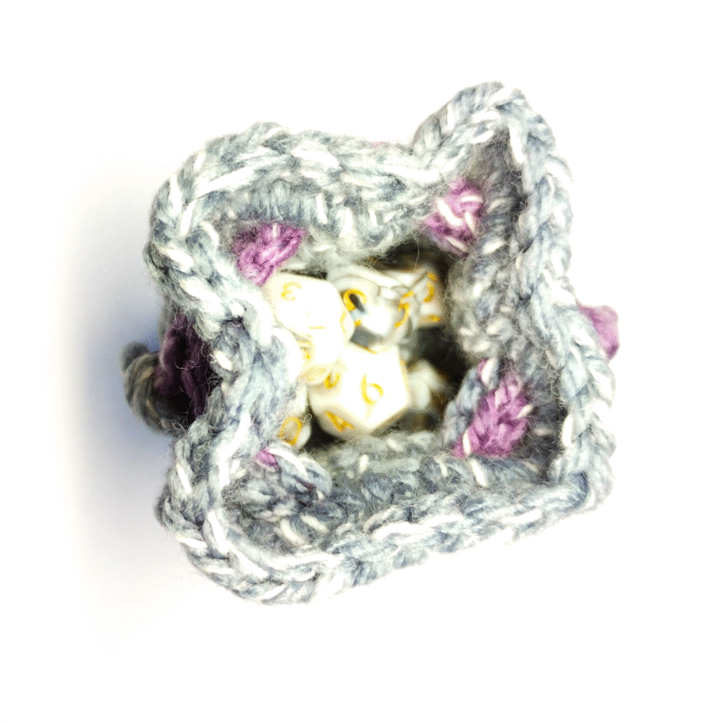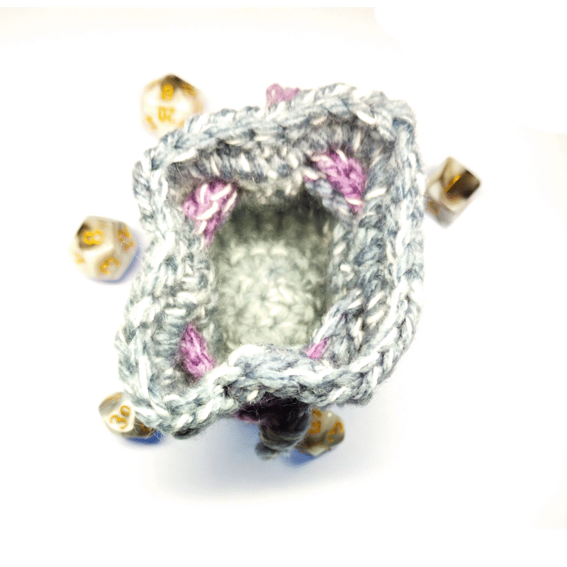 Handmade grey and purple crocheted drawstring dice bag with adorable mini 7 piece dice set. Dice are all around 8-12mm, see the photo with the purple D6 dice for scale.