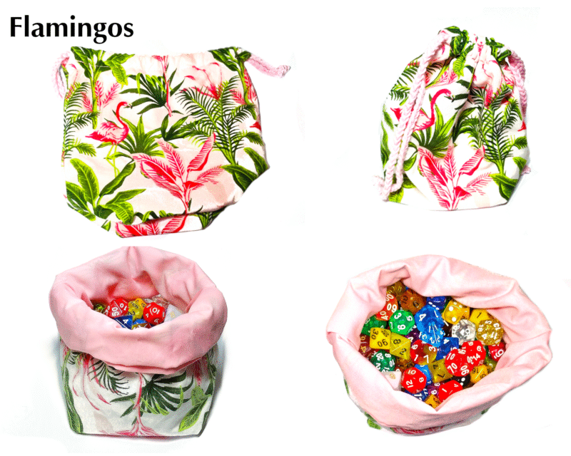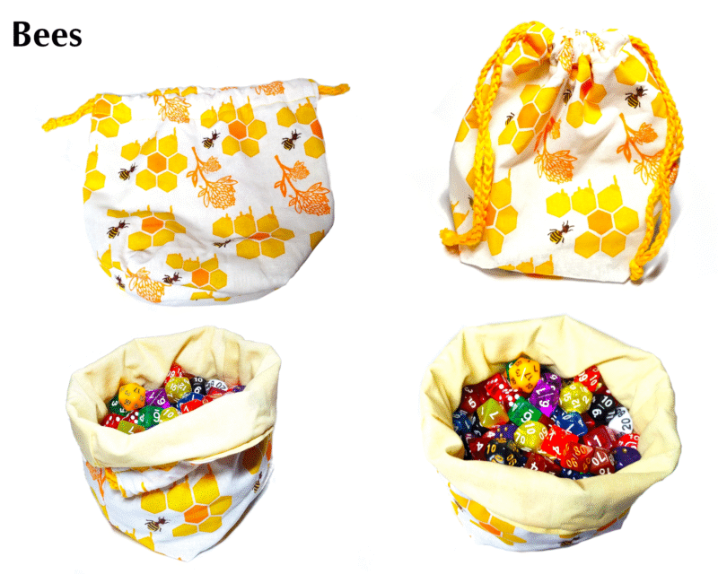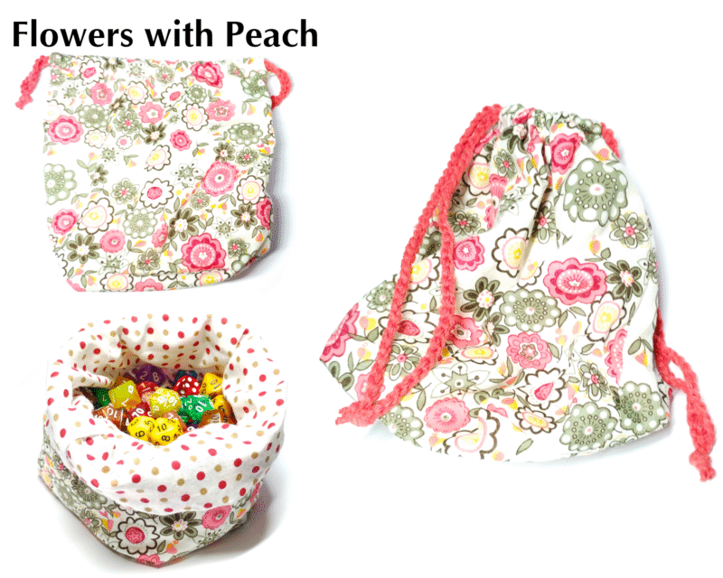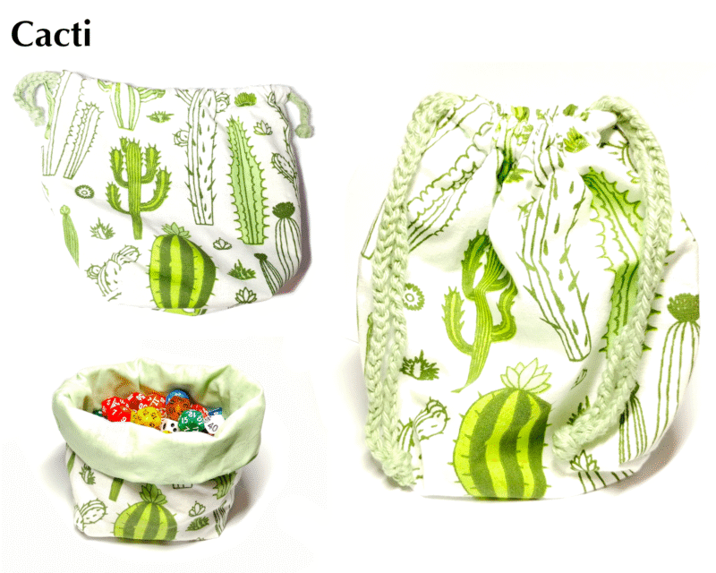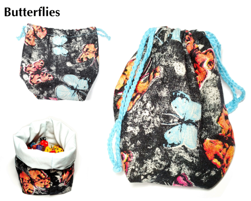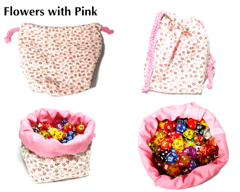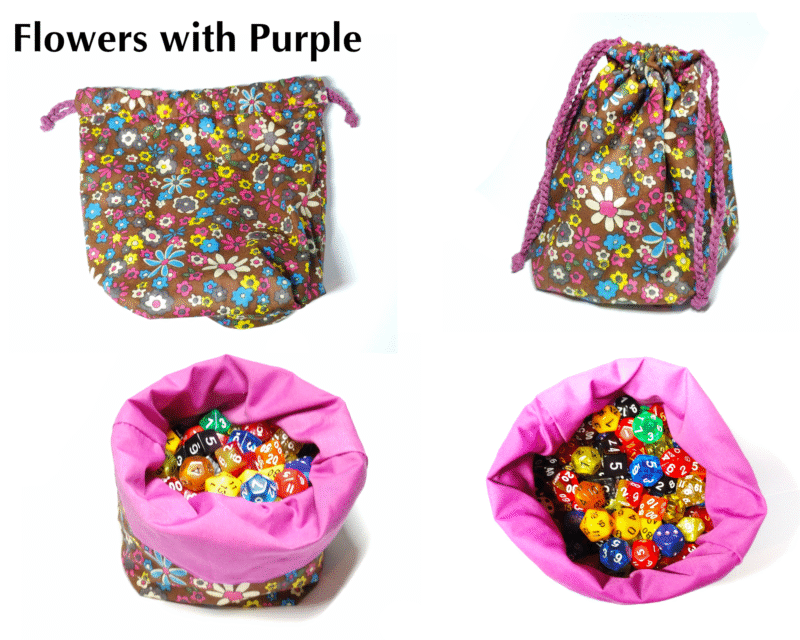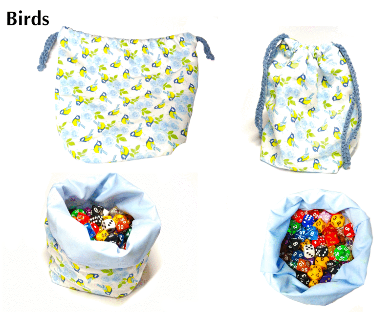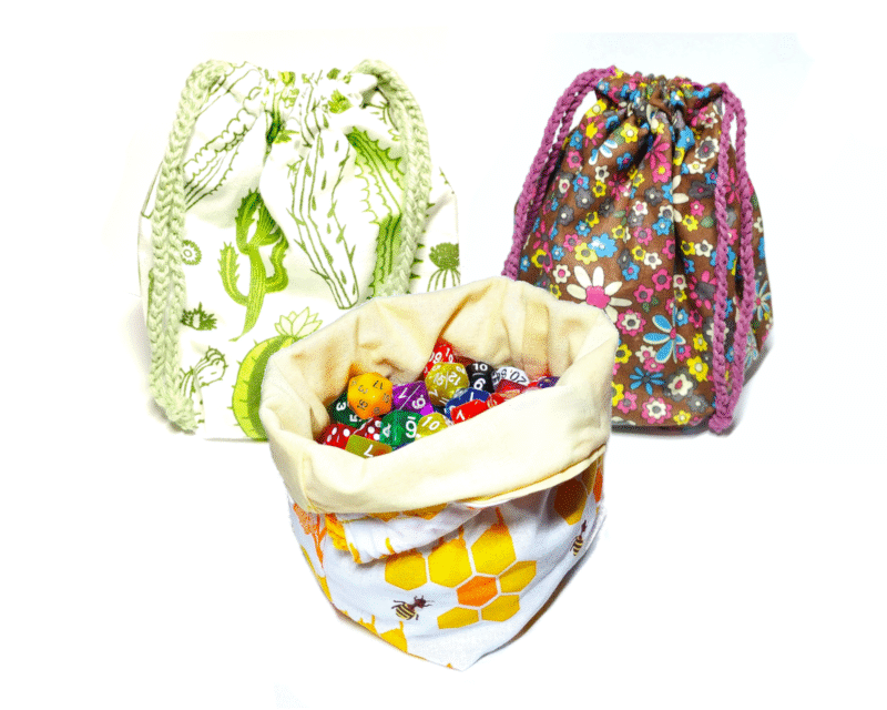 Patterned handmade fabric drawstring bags, each made with a lining and drawstring in complimentary colours and a tailored square base so that it sits nicely on a table. Roll down top for easy access to dice as demonstrated in the photos. All made with 100% cotton fabric and yarn drawstring.