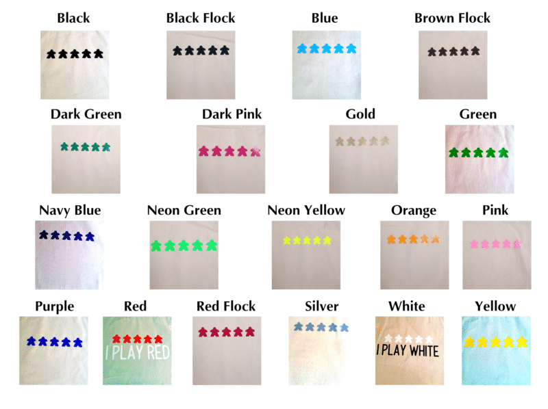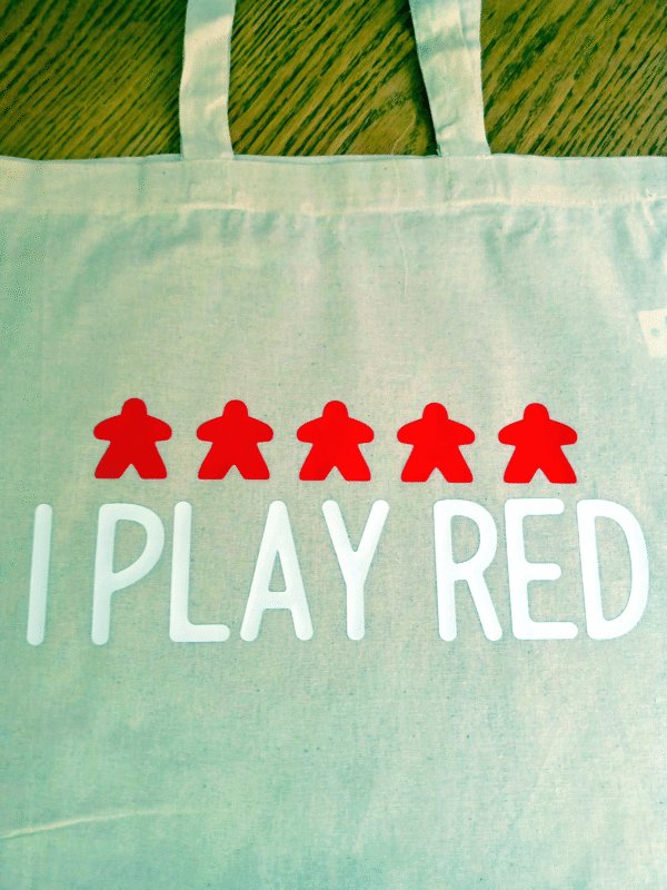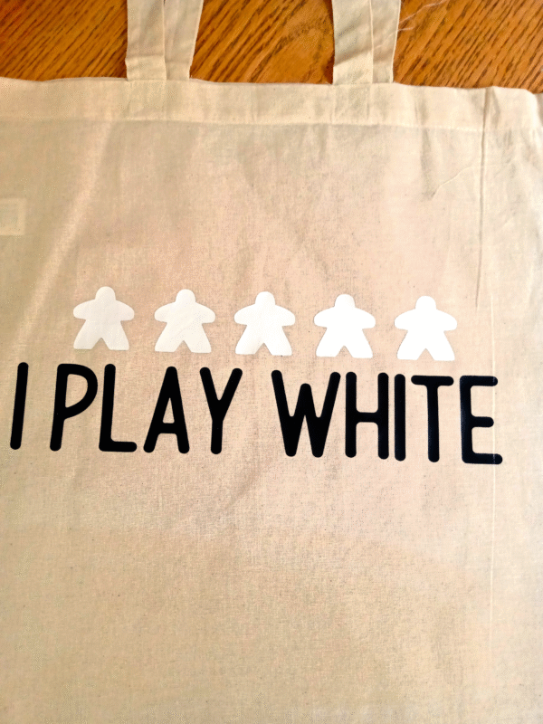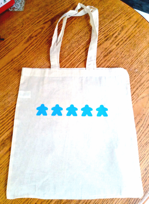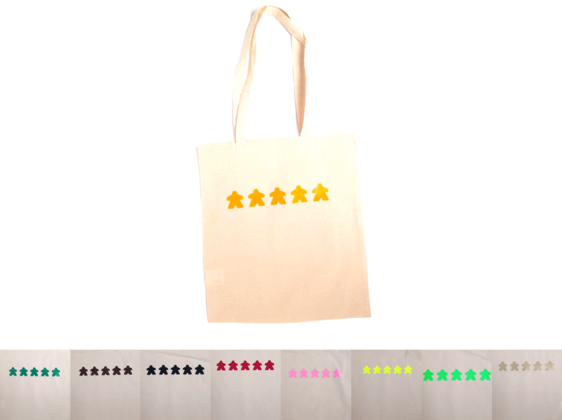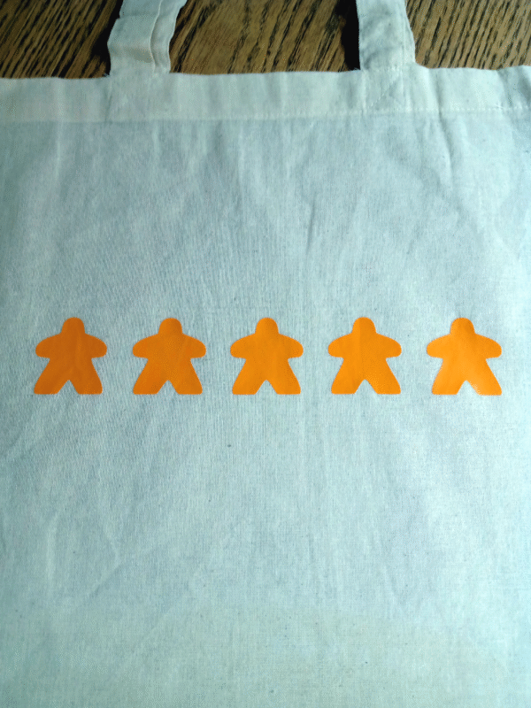 Made with vinyl applied to one side of the tote bag. The bag itself was not made by me, I have added the meeples and text to pre-made bags. Some of these bags have darker beige areas on them, I think because they’re natural cotton.